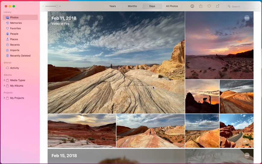 Приложение Фото. Все свои альбомы и виды контента вы найдете на боковой панели, а область с фотографиями работает на технологии Metal, поэтому анимация очень плавная, прокручиваю ли я страницу, перехожу от одного к другому фото, увеличиваю или уменьшаю масштаб.
