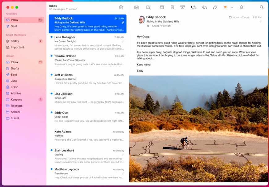 Приложение Почта. На боковой панели Почты появились новые значки, и для них вернулись цвета. Каждое приложение использует свой ключевой цвет. Тот же цвет используется для нового элегантного выбора строк, здесь, в списке сообщений.