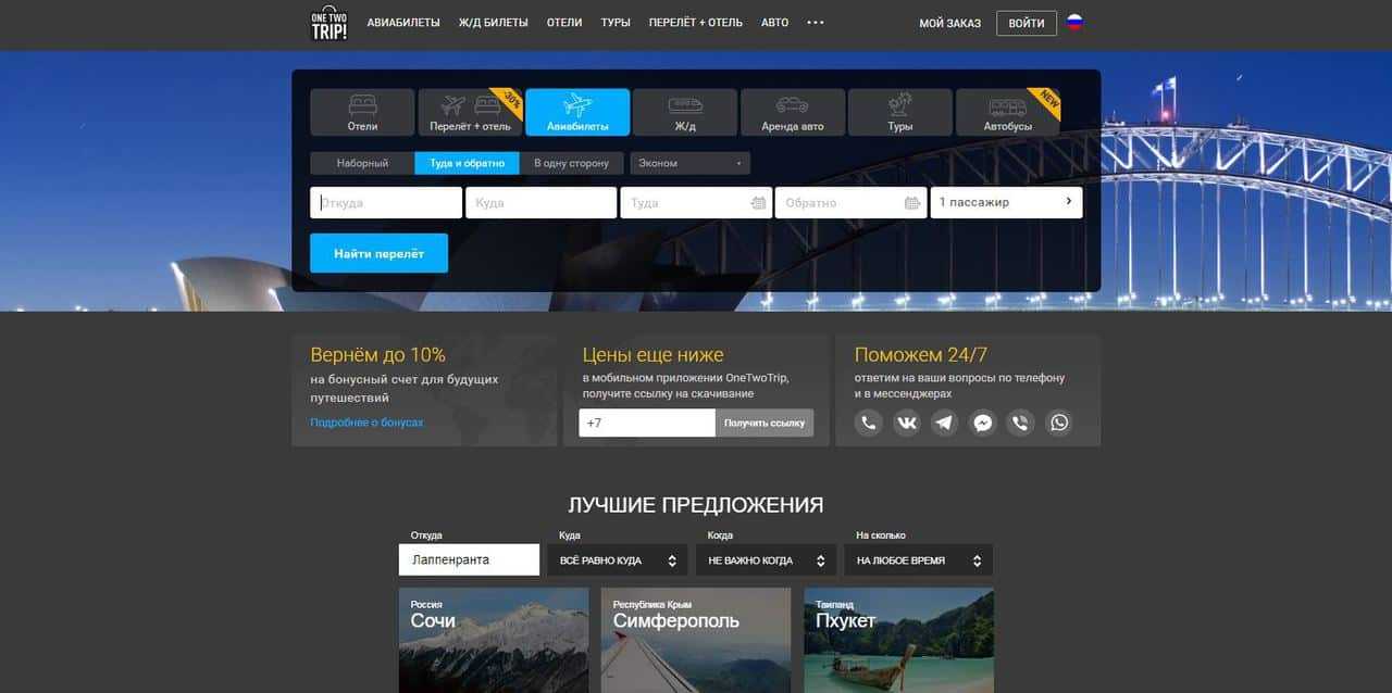 Особенностью сервиса является наличие бонусной программы. OneTwoTrip возвращает до 10% с каждого бронирования, бесплатно предоставляет часть услуг, к примеру, смс-оповещение, выбор места и возврат билетов.