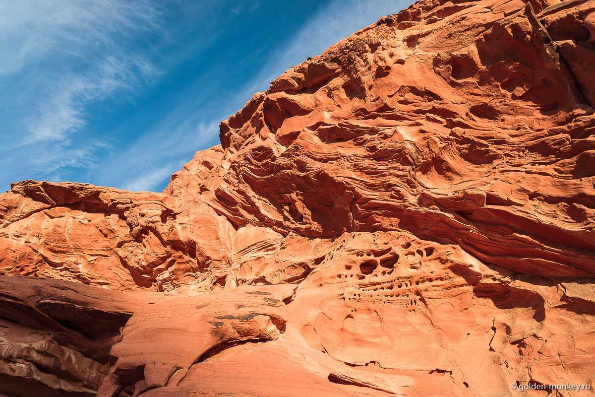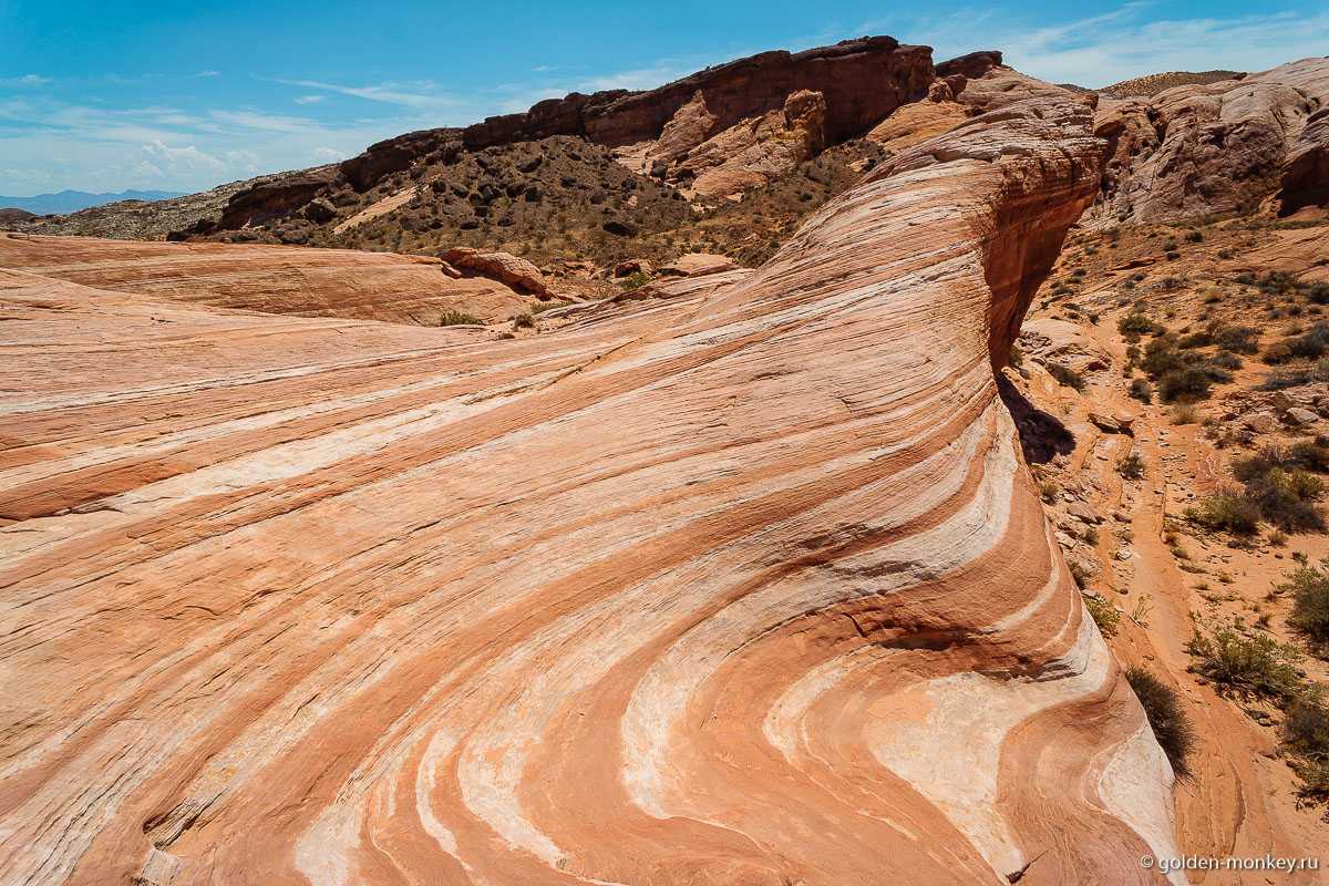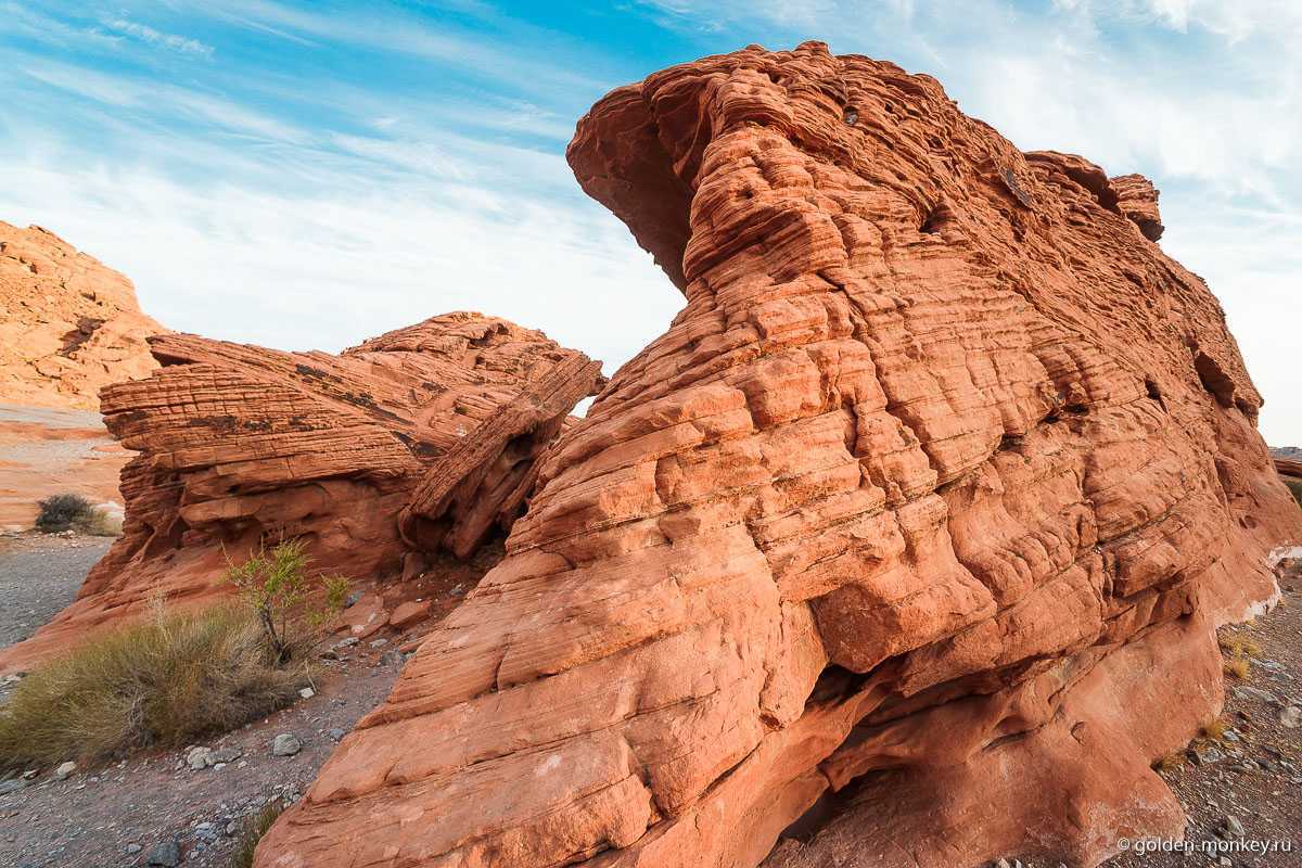 Одна из самых живописных и любимых туристами частей парка та, где скрываются так называемые «огненные волны». Наверно, многие видели в сети шикарные фотографии, на которых красуются плавные, мягкие, извивающиеся песчаные «волны» яркого оранжево-красного цвета. Так вот, самое популярное место, где их можно увидеть, это уже упомянутые мною Coyote Buttes. Попасть туда весьма непросто, потому что количество людей, которые могут увидеть тамошнюю красоту, строго ограничено. Но не все знают, что в Долине Огня есть нечто похожее, причем увидеть эти «волны» можно совершенно безо всякого труда. Поверьте, местечко очень эффектное!