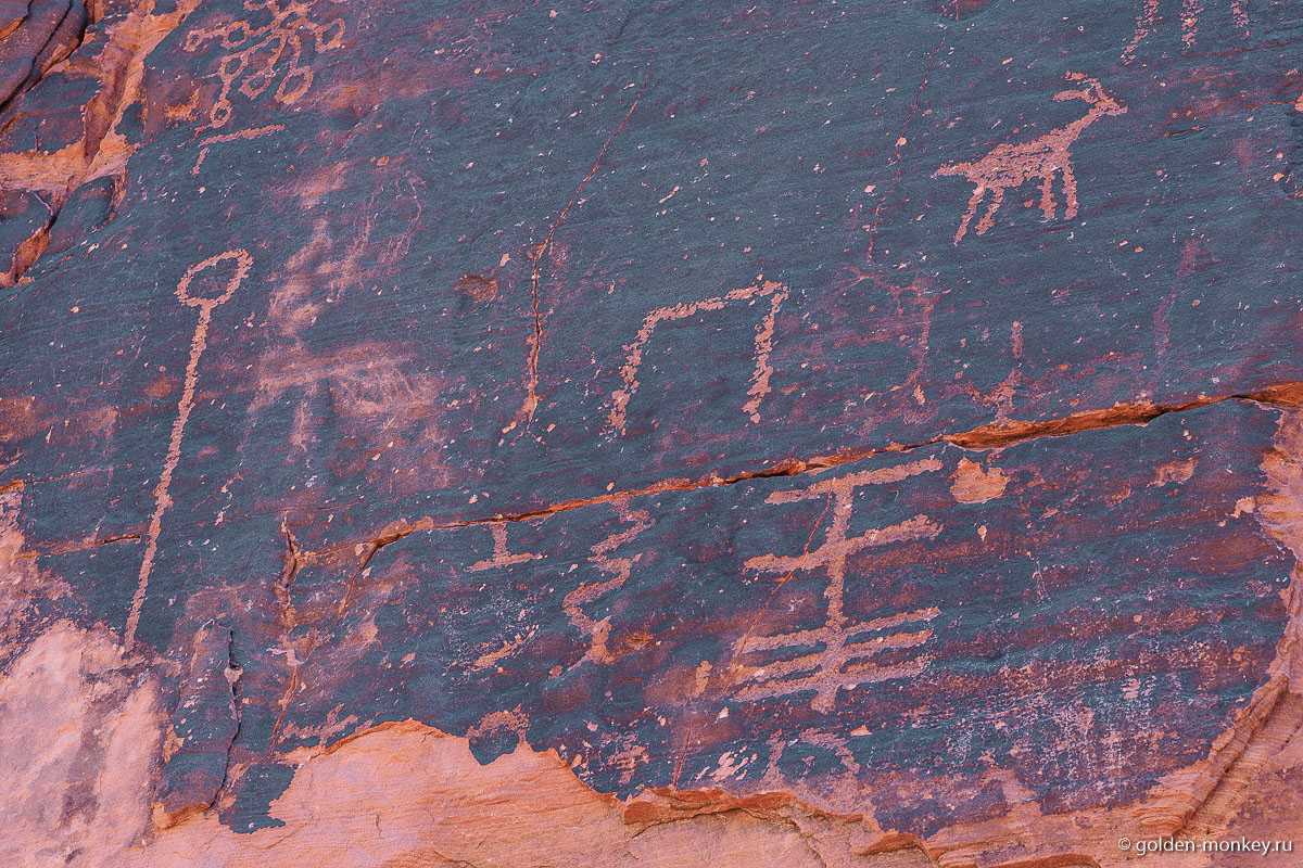 Оказалось, это еще далеко не все, на что способна Valley of Fire. Кое-где она припрятала на своих склонах древние петроглифы. Там и козы, и человечки, и какие-то палочки с пупырками, черточки, зигзаги, в общем, много непонятных знаков. При желании, можно попытаться их расшифровать, в начале трейла предлагается незамысловатая инструкция.