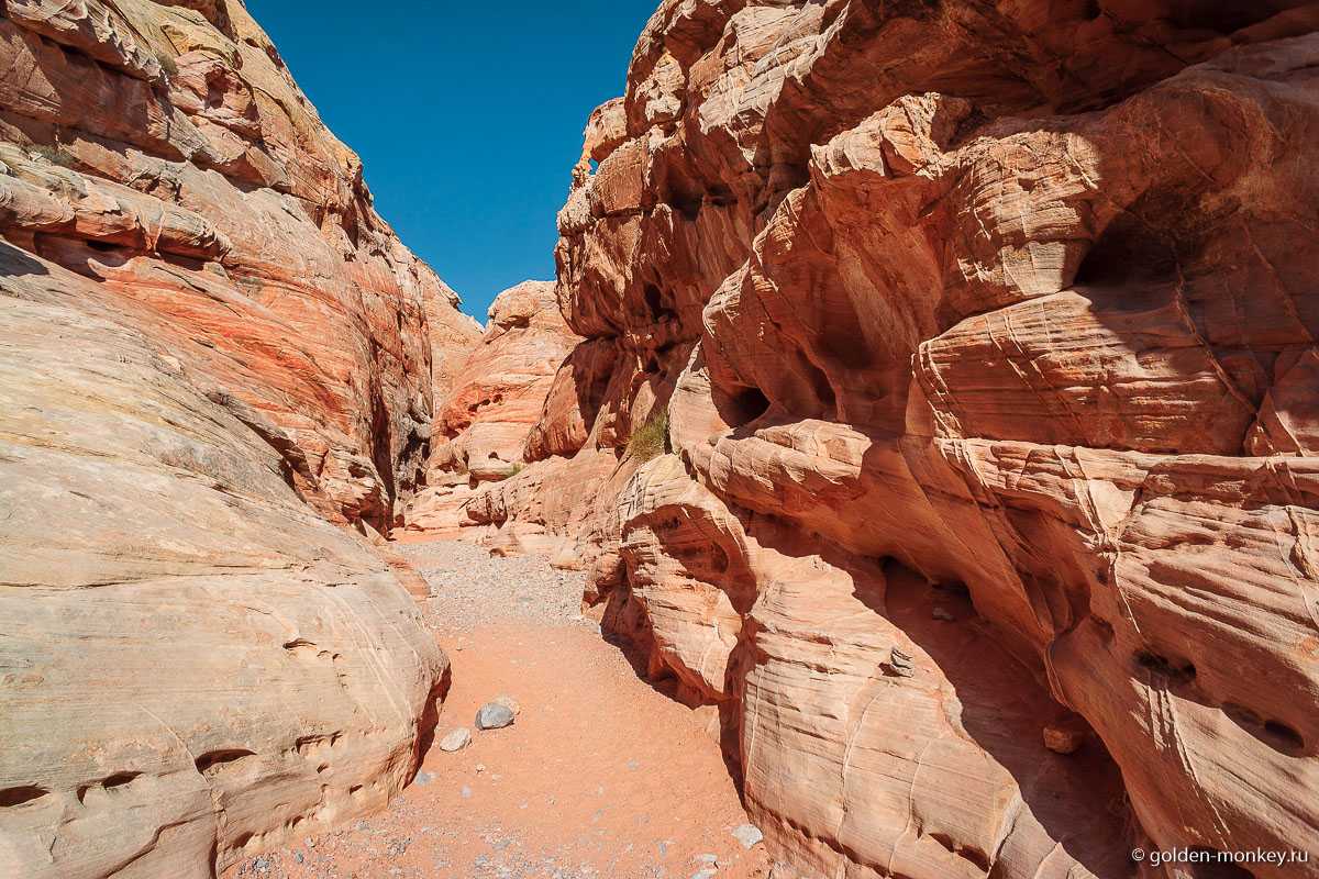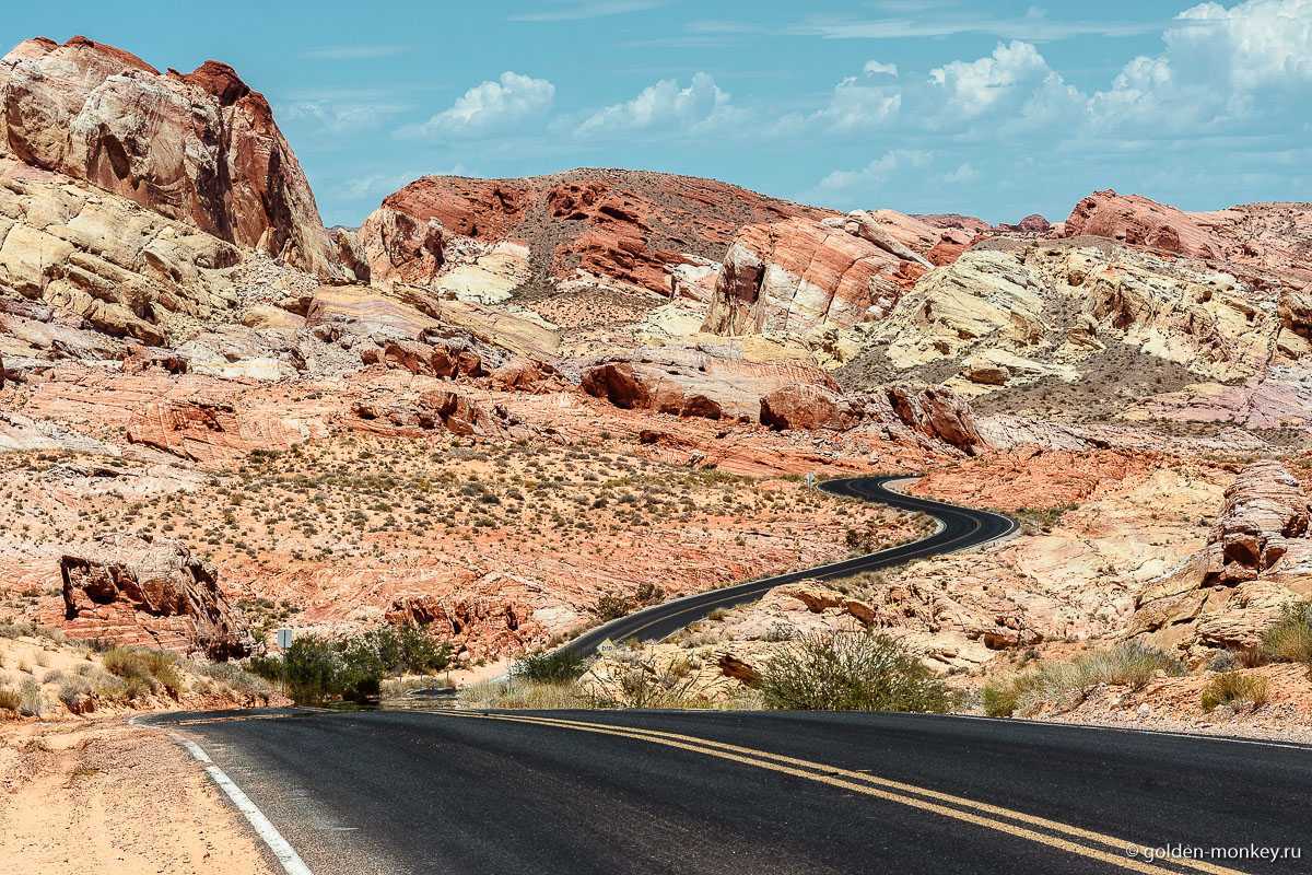 Путешествие лучше начинать от Лас-Вегаса. Колоритное, убегающее вдаль полотно поведет дорогой контрастов мимо мраморных скал, песков и каньонов. Первой остановкой станет вымерший город-призрак Риолайт – заброшенное поселение бывших старателей, а ныне музей под открытым небом. Безмолвное величие призрачных скульптур, полуразрушенные здания прошлого века как нельзя лучше погружают в атмосферу затерянного города. Внимания заслуживает необычный Пивной дом, отстроенный из настоящих бутылок. По местным поверьям, отсюда порой доносятся звуки призрачного оркестра.