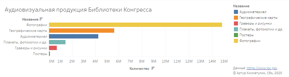 Библиотека Конгресса отчитывается: в ее фондах более 130 млн единиц аудиовизуальной продукции. Но какой? Среди них есть фильмы, музыка (даже нотные записи!), географические карты, постеры, гравюры, фотографии, в фондах хранят даже GIF-анимацию и микроформы — специальные миниатюрные копии фотографии, пленок с фильмами и даже миниатюрные печатные документы, их еще называют микрофишами.