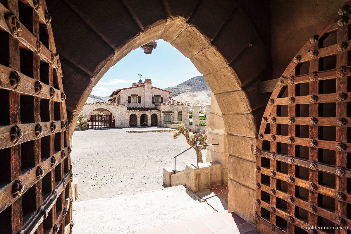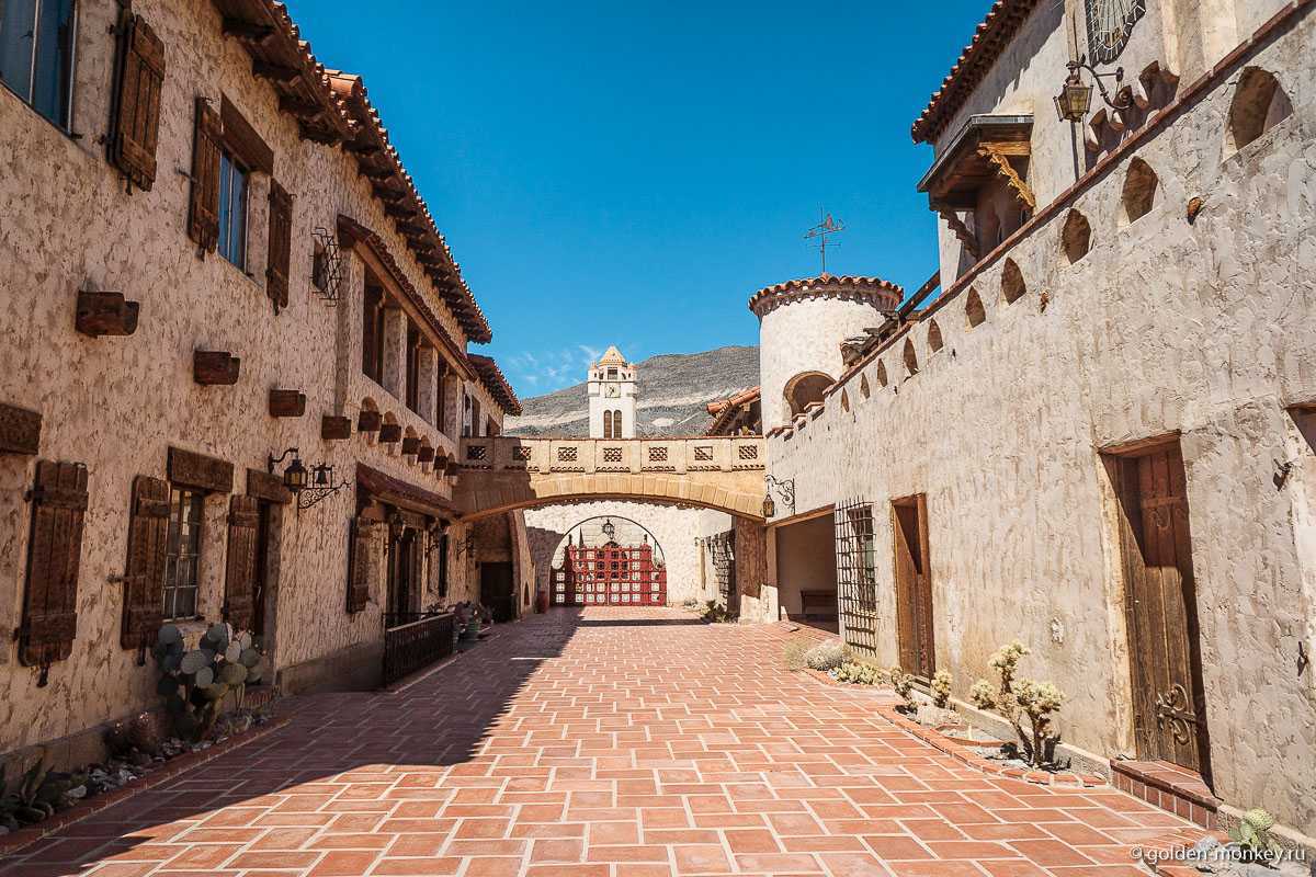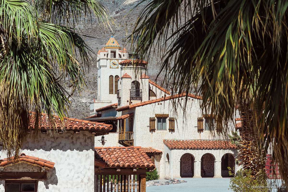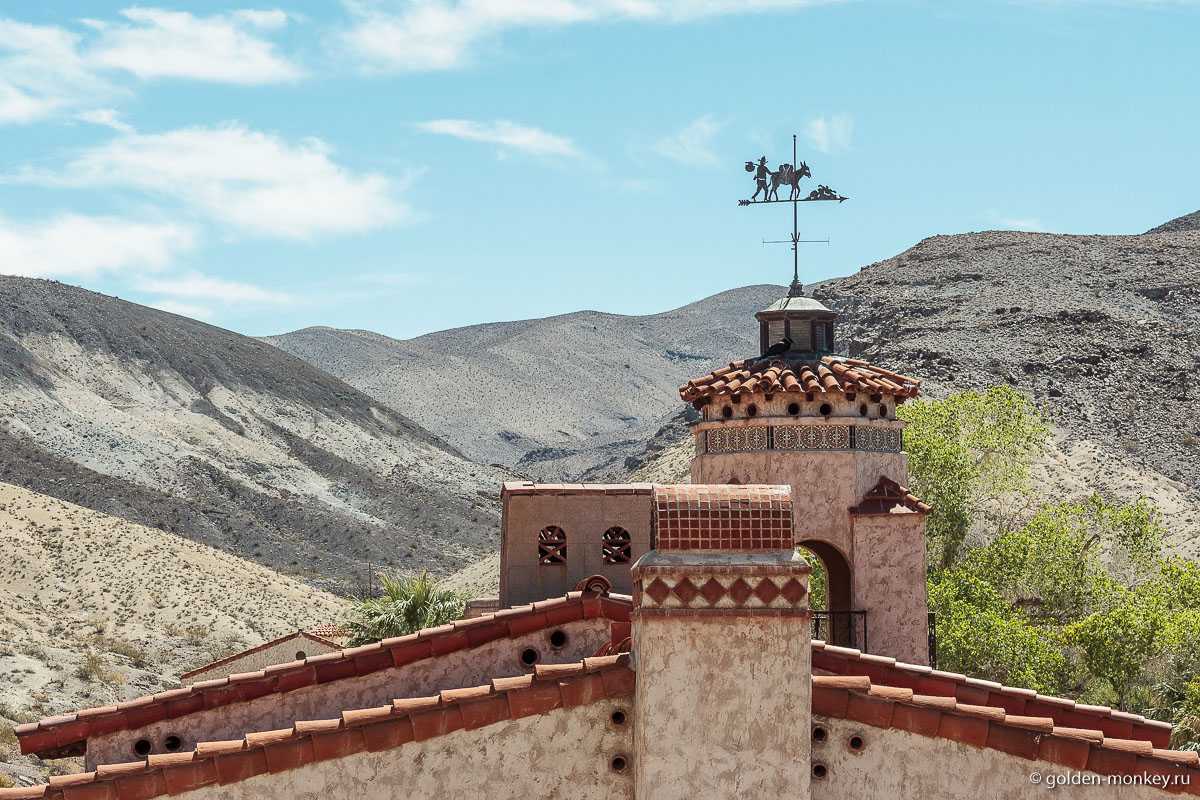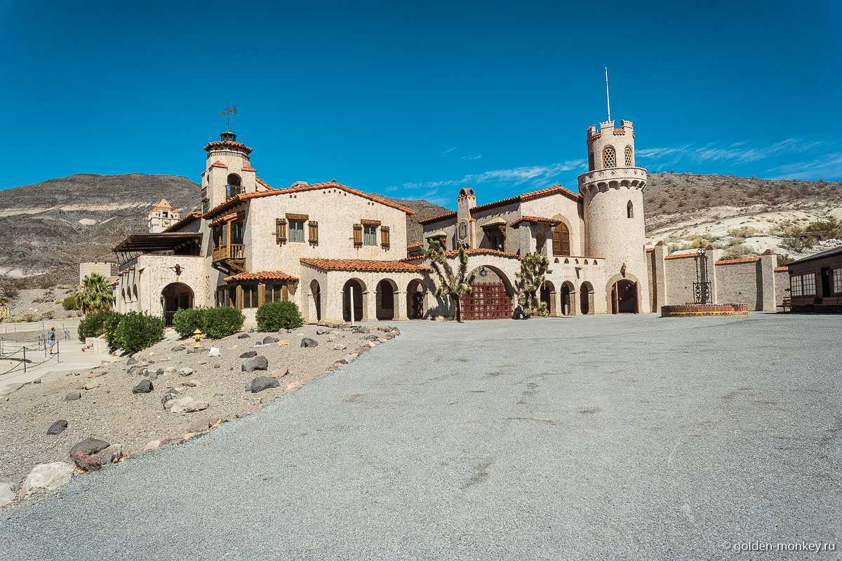 Описание: жил был некогда Уолтер Скотт, который занимался поисками золота в Долине Смерти. Так долго искал, что его даже прозвали «Скотти из Долины Смерти». Заявил как-то Скотти во всеуслышание, что нашел-таки месторождение, и некий магнат Альберт Джонсон согласился его профинансировать. Последний как-то приехал проведать друга вместе с золотишком и не нашел никаких богатств. Однако, приехал больным, а за несколько недель стал здоровым. Даже простил Скотти, что тот обманул насчет найденного золота. Вместо того, что злиться и обижаться, магнат построил целый замок для себя и своей жены, чтобы та могла приезжать отдыхать «на курорт». Ну, и Уолтеру маленький домик пристроил рядом. Вот так и появился в Долине Смерти замок в стиле испанского ранчо, названный отчего-то именем Скотти.