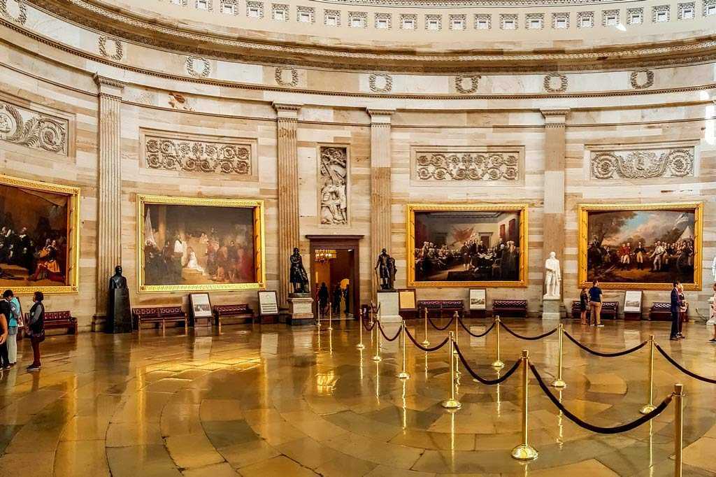 - Картины в зале ротонды – сюжеты живописи посвящены развитию США, как государства, формированию ценностей нации, открытию материка и так далее;