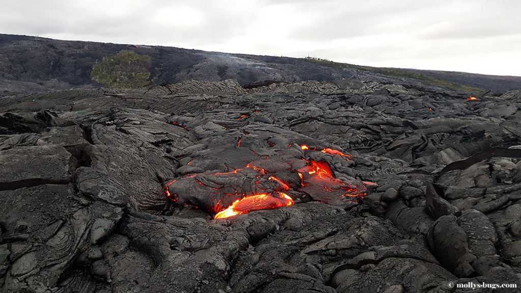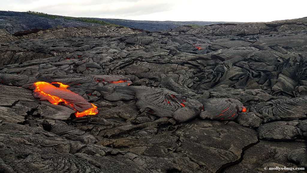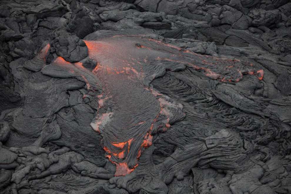 Из-за того, что наше жилье находилось на расстоянии двух часов езды от Национального парка вулканов, мы смогли до него доехать только к полудню, поэтому начали свой поход мы только в 13:00. Первые несколько миль шли по гравийной дороге, которая то поднималась, то опускалась. На этом участке не сложно сохранять быстрый темп ходьбы. Однако через 3-4 мили вы увидите, что дорога закрыта, из-за обвалов. Дело в том, что, постоянно вытекая, лава наслаивается пластами друг на друга, создавая тяжесть, которую земле сложно выдерживать. Из-за этого в этой зоне часто случаются оползни, которые обваливают огромные участки суши в океан. Поэтому здесь надо было поворачивать и идти по лавовому полю прямо по направлению к вулкану. В этой зоне скорость движения очень падает, так как невозможно идти быстро и напрямую по застывшей лаве – она очень неравномерно застыла, поэтому некоторые участки приходилось обходить и времени на это уходит значительно больше. Через часа 2 ходьбы по хрустящей и хрупкой застывшей лаве мы наконец увидели ту самую, раскаленную и огненно-красную. От ее вида буквально перехватило дыхание. Все потому, что температура выхода лавы на поверхность составляет 1100 градусов по цельсию. Поэтому вы можете даже не увидеть ее, но почувствовать, что зашли в огромную духовку. От ее жара плавится все вокруг. И здесь надо быть максимально собранным и аккуратным — под воздействием настолько высокой температуры застывшие участки лавы могут провалиться, и вы вместе с ними.