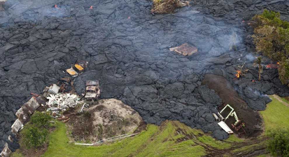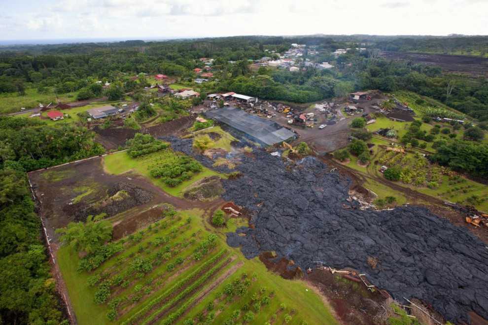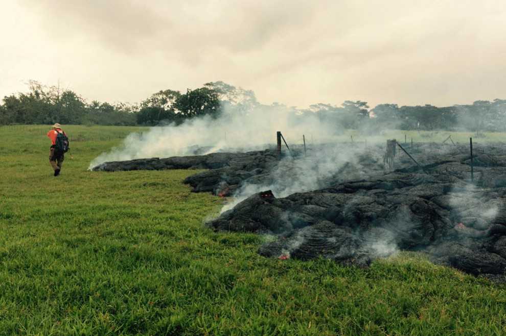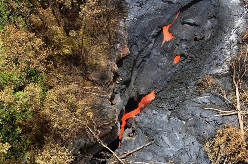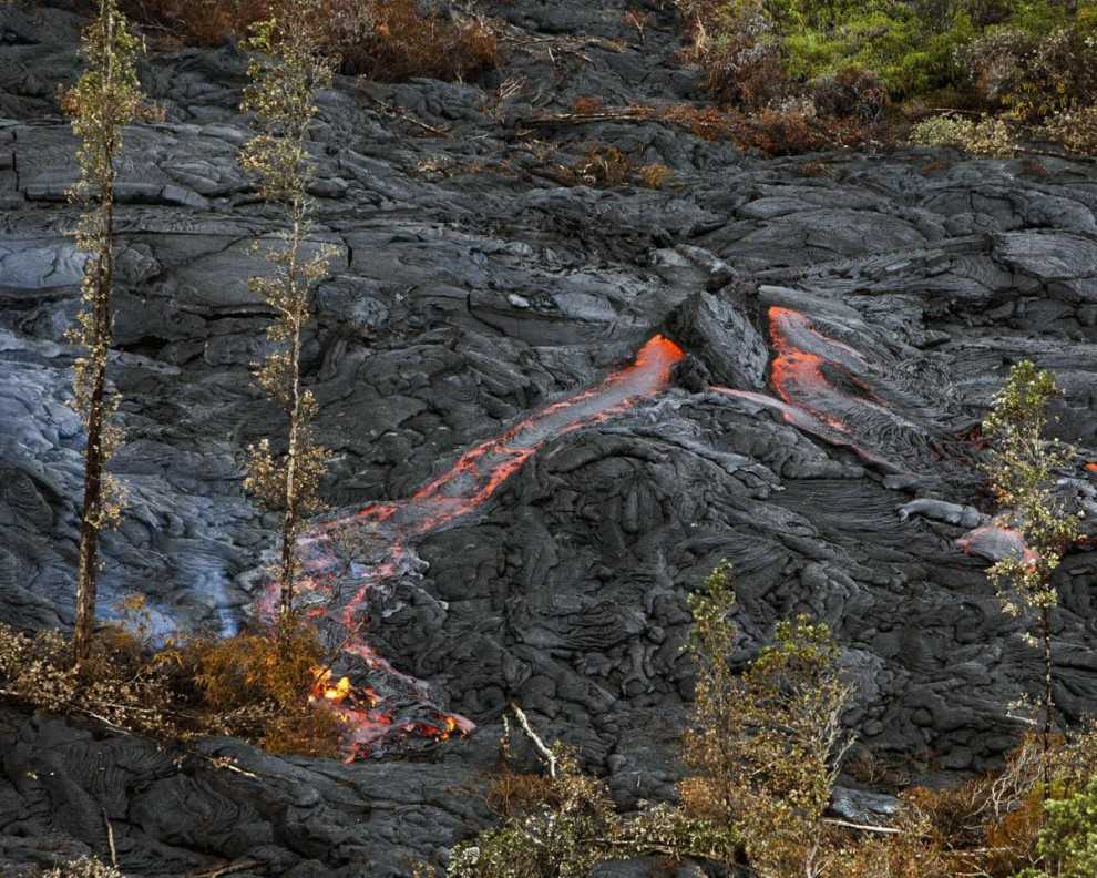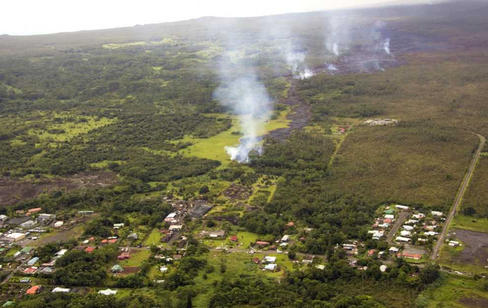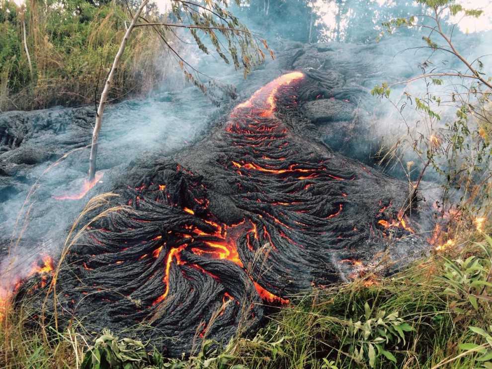 Потоки лавы уничтожают растительность в окрестностях деревни Пахоа.