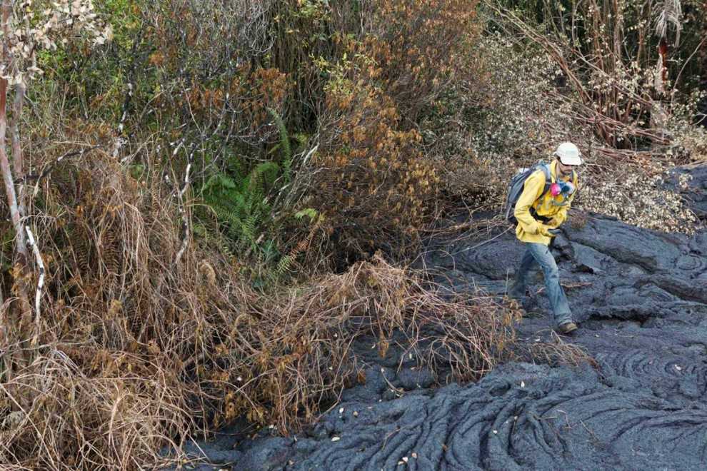 Геолог из Обсерватории гавайских вулканов наносит на карту границы потока лавы вулкана Килауэа при помощи GPS-прибора, 1 ноября 2014 года.