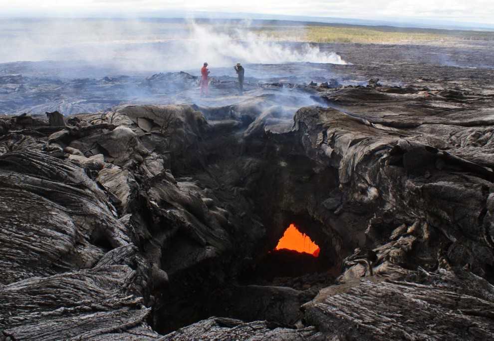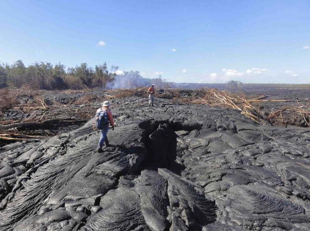 Геологи из Обсерватории гавайских вулканов исследуют поверхность потока лавы недалеко от деревни Пахоа, Гавайи, 22 октября 2014 года.