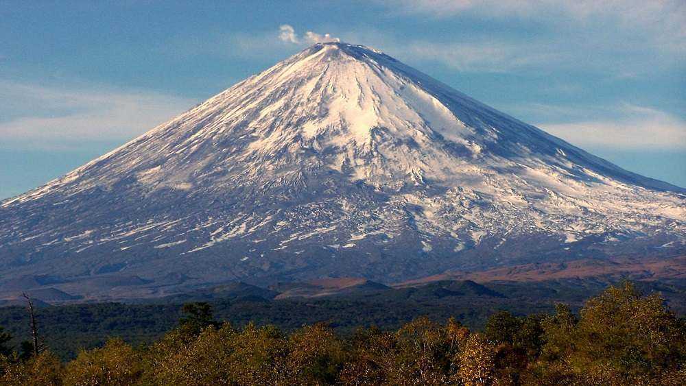 В России тоже есть свой действующий вулкан, он находится на Камчатском полуострове. Вышиной 4756 метров и является самым большим в России и Евразии. Хоть на полуострове расположены 300 огненных гор, только 30 из них можно отнести к активным. Один из самых красивых на всей планете с практически идеальной конической формой, покрытый льдами и снегом. Каждые 3-5 лет он извергается примерно по три месяца. Обладает густой по консистенции лавой, из-за этого процесс извержения не так активен.
