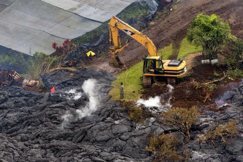 Рабочий пытается замедлить движение потока лавы, поливая его водой.