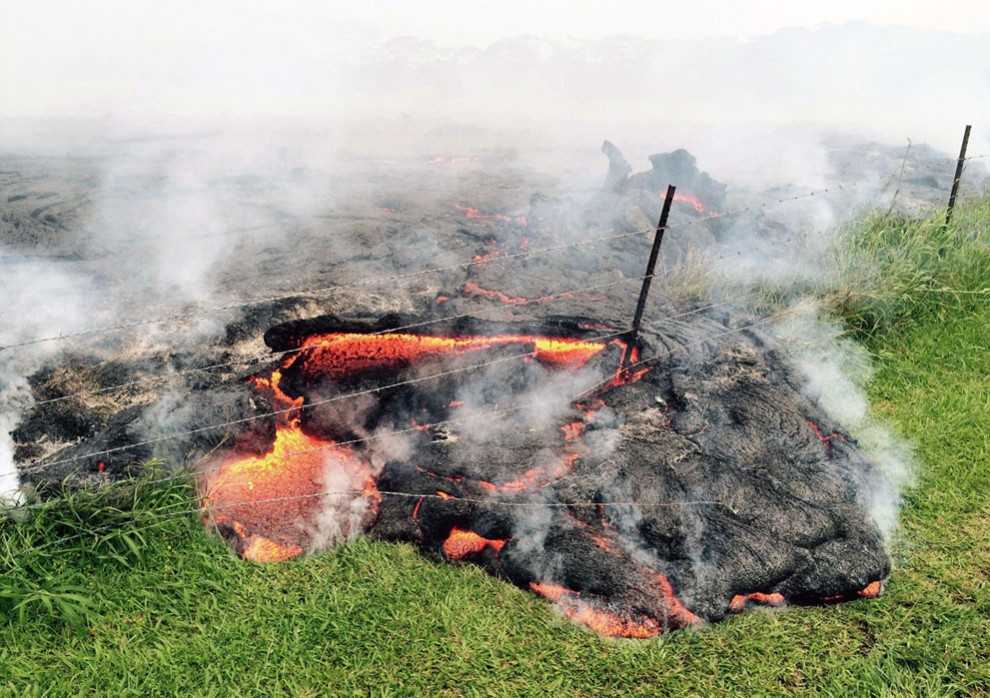 Поток лавы переливается через забор, огораживающий частное владение недалеко от деревни Пахоа.