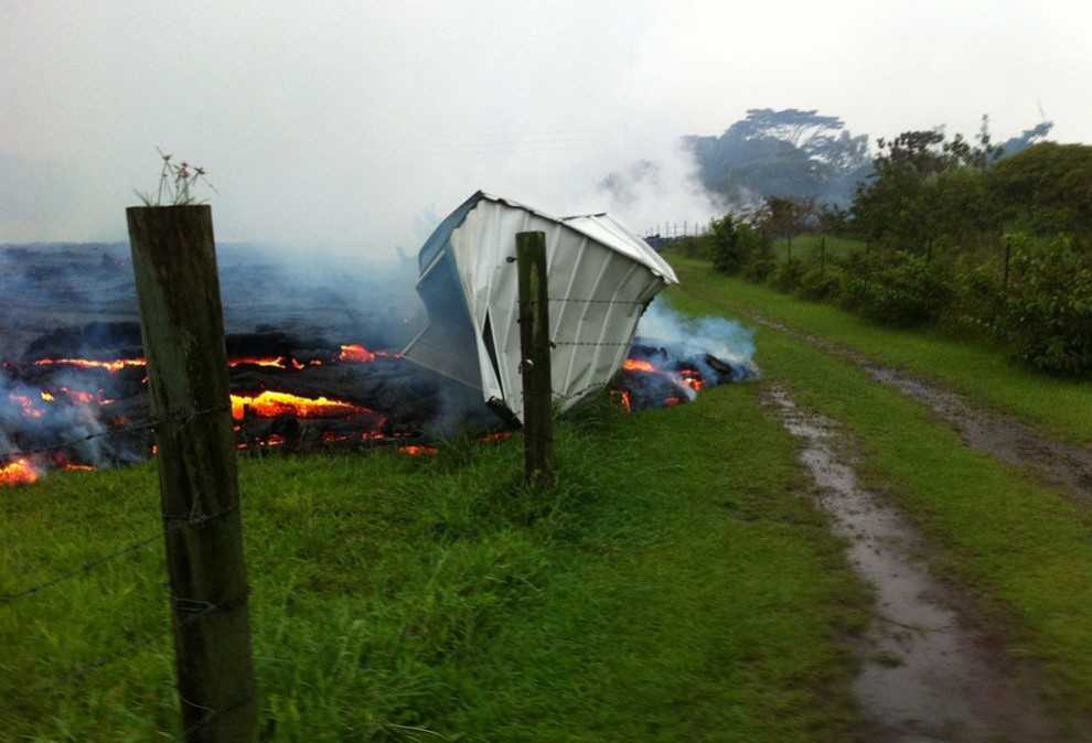 Поток лавы уничтожает домик на пастбище между кладбищем в деревне Пахоа и улицей Апаа, 25 октября 2014 года.
