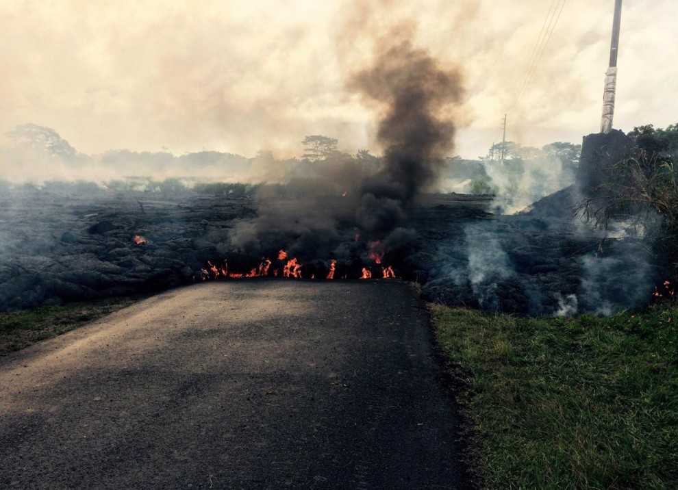 Поток лавы пересекает улицу Апаа и движется в сторону деревни Пахоа.