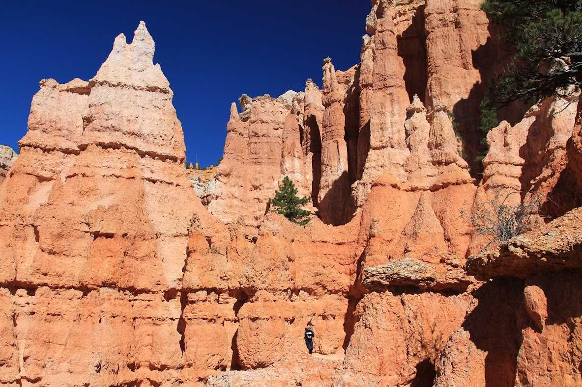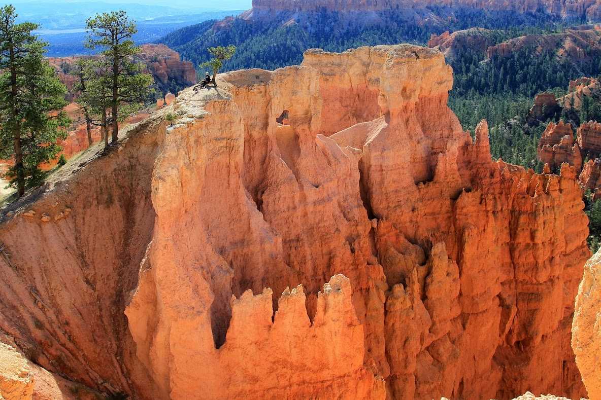 Уходящие вниз осыпи утыканы несчитанным количеством худу, шпилями и пластинами, которые будто светятся изнутри теплым оранжевым светом. Высоту этих образований сложно осознать, пока не увидишь рядом что-то привычное для масштаба. Например, если присмотреться, то на фотографии ниже можно увидеть Нат, сидящую на корнях небольшой сосны.