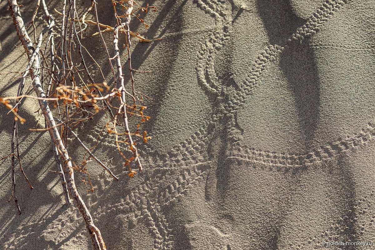 Говорят, дюны особенно красиво выглядят на закате, когда лучи предзакатного солнца подчеркивают все тени и складочки, зато на рассвете можно увидеть на песке следы ночных жителей.
