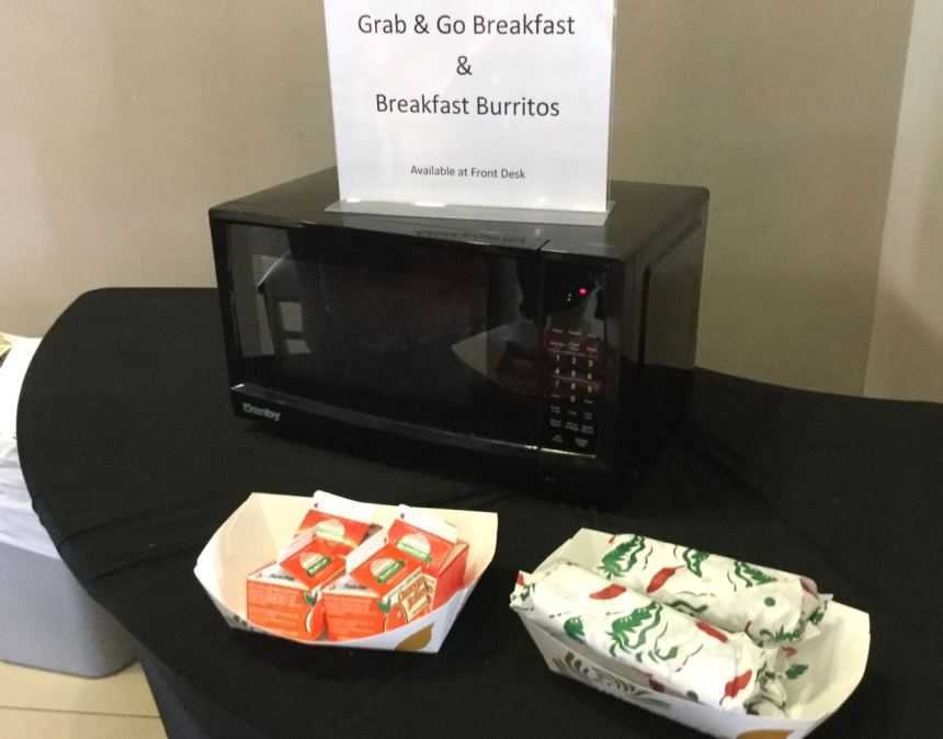 На завтрак постояльцы отеля могли самостоятельно налить себе кофе в фойе и взять «продуктовый набор», состоящий из маленькой упаковки сока и буритос. Все это можно было разогреть в микроволновке и скушать за столиками на открытой террасе.