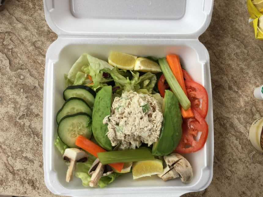 Обедали в закусочной гостиницы, где порадовал салатик с тунцом и почему-то сырыми шампиньонами: