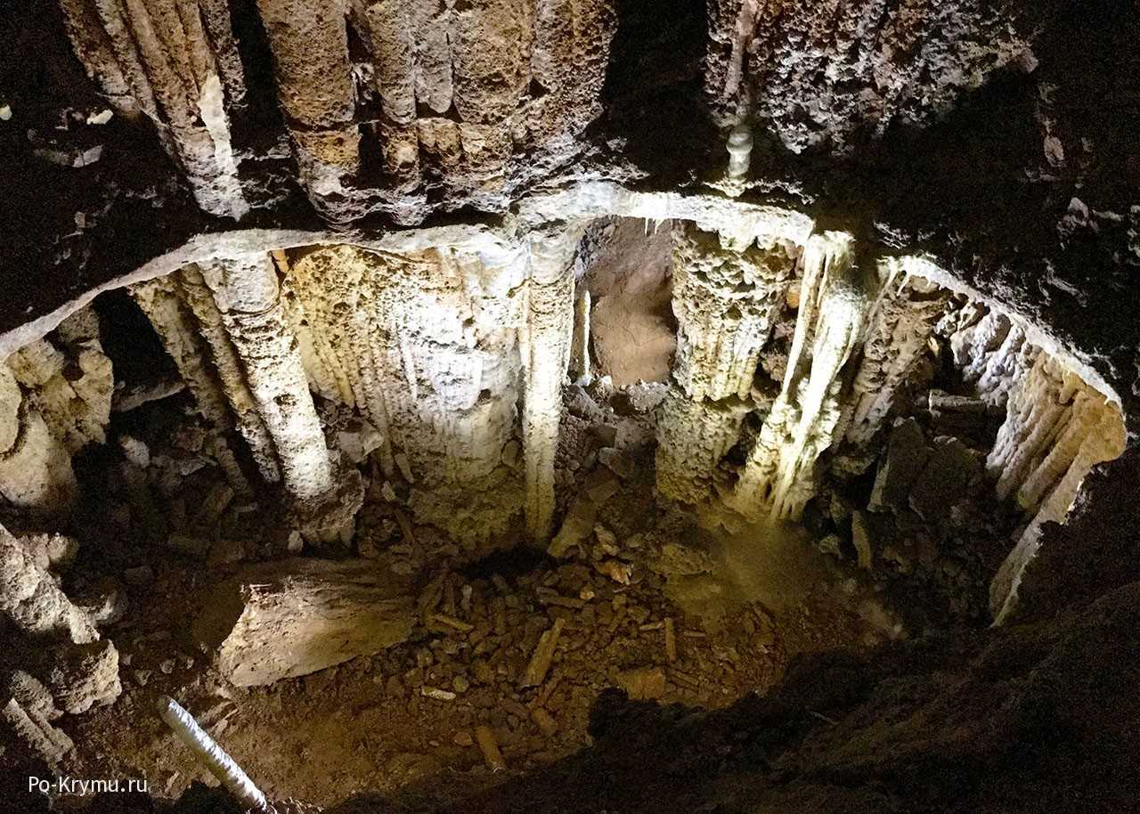 Главный зал – обширный грот, около 120 метров в длину, почти в центре потолка которого на высоте 40 м. и находится тот самый колодец, который долгое время служил входом в пещеру. И он же, кстати, является природной ловушкой, благодаря которой здесь скопилась немало костей древних животных. Они падали в провал, погибали, а их останки постепенно заносило илом. Самая главная находка палеонтологов — почти целый скелет мамонта, за что пещера и получила название — Мамонтовая.