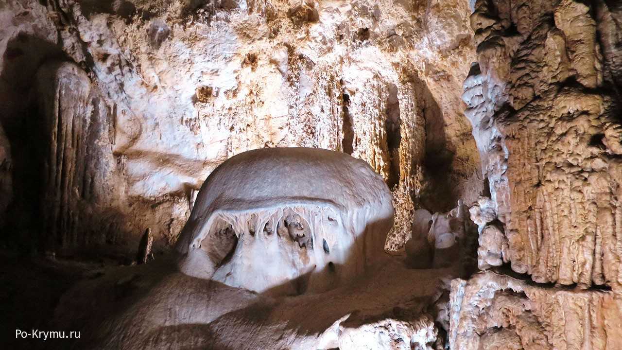 Тронный зал привлекает, наверно, самым своеобразным образованием пещеры Эмине-Баир-Хосар — Шапкой Мономаха. Если честно, больше напоминающей череп, солдатскую каску или медузу.
