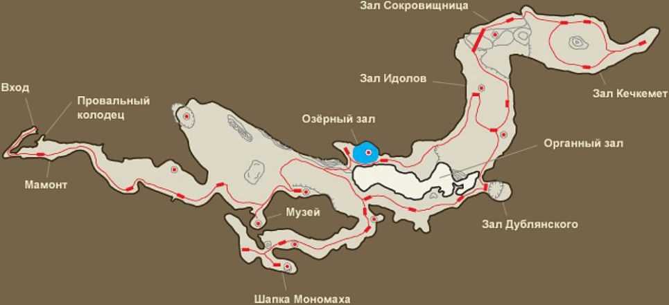 Последующие исследования выявили пять уровней пещеры – от 30 до 180 м. В ней холодно всегда – не более 5 °C, а влажность близка к 100 %. Общая протяженность 12 обнаруженных залов составляет два километра. Ниже приведена схема пещеры.