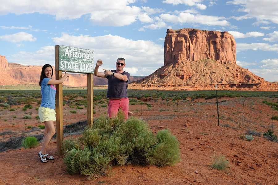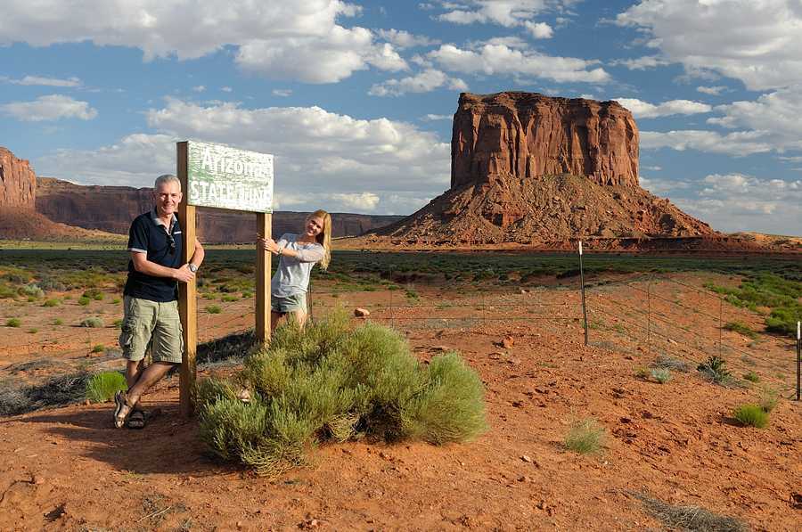 Долина Монументов расположена на границе штатов Аризона и Юта. Границы как таковой нет – есть старая большая табличка с одной стороны написано Юта, с другой Аризона. Вдоль дороги протянута проволока, это для коров, которые пасутся вдалеке.