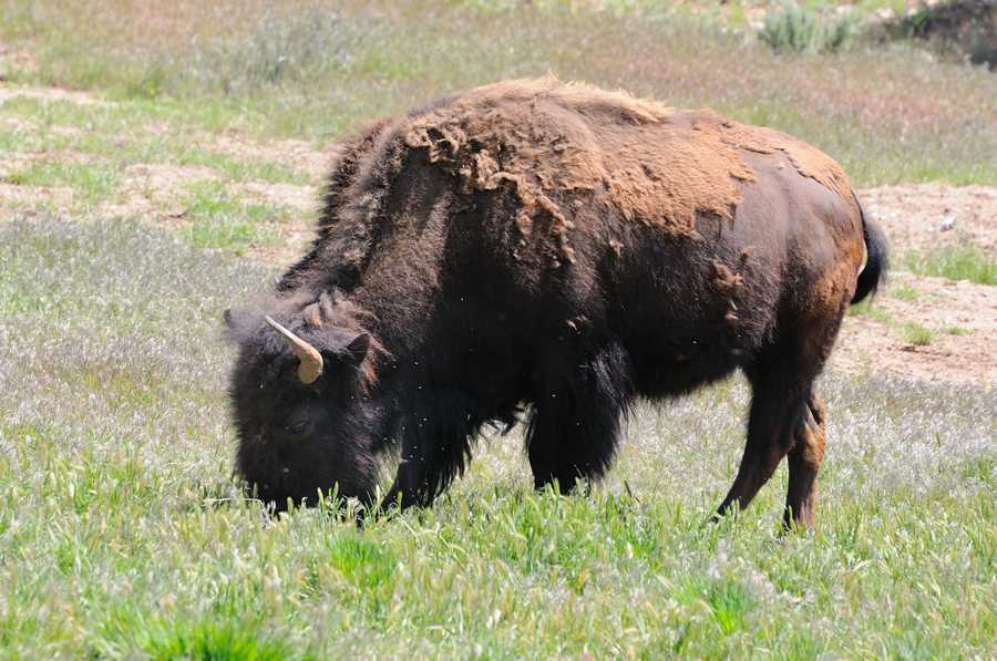 По дороге пасутся бизоны. Примерно как у нас коровы.