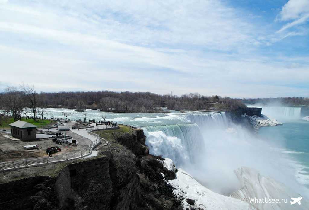 Ниагарские водопады — это водопад «Подкова» (Horseshoe Falls или Canadian Falls), Американский водопад (American Falls) и водопад «Фата́» (Bridal Veil Falls). На фото чуть ниже слева американская часть. Справа видно отделённый островком кусочек воды, и правда похожий на фату невесты. Кстати, на этом островке есть смотровые площадки, вот оттуда вид, наверное!