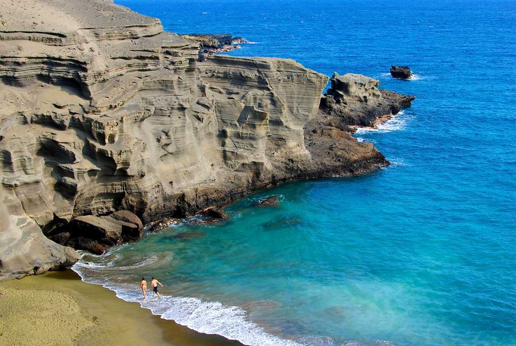 Пляж Грин Сэнд более известен под названием «Пляж зеленого песка» и располагается в незаселенной области северо-западного побережья острова Гавайи, в 3х милях к востоку от живописных скал Ка Лаэ (Саут-Пойнт) в южной части штата. Он уникален тем, что его песок имеет зеленый оттенок, от оливкового до изумрудно-болотного. Связано это с наличием на побережье большого количества хризолита (что в переводе означает «золотой камень») – полудрагоценного кристалла, рожденного Гавайским вулканом более 49000 лет назад. В скалистых выступах, которые окружают пляж, также присутствуют частицы зеленого бриллианта.