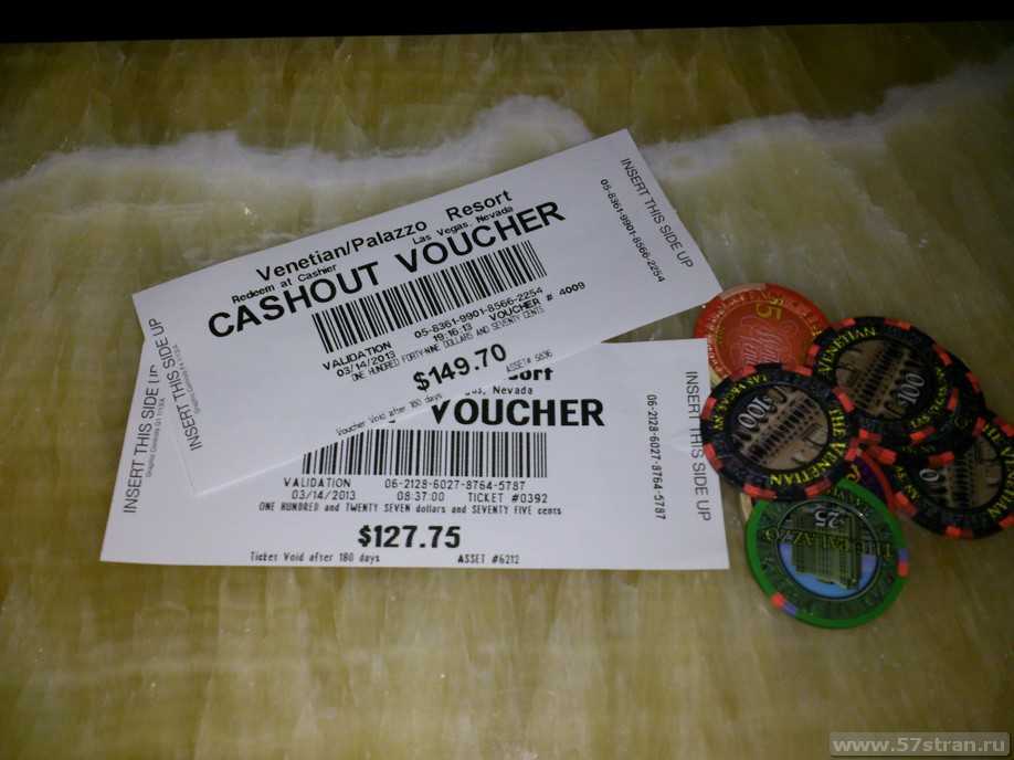 Игровые автоматы принимают деньги и вот такие ваучеры. Расплачиваются ими же. Если хотите наличные за свой ваучер – вставьте его в аппарат с надписью Ticket Redemption. Аппараты с надписью Bill Breaker меняют деньги на номинал ниже, например 5 долларов на пять купюр по 1. Очень полезная функция с учетом практической обязательности чаевых. 1 доллар за напиток – стандарт. Сами напитки в казино, естественно, бесплатные. Фишки для настольных игр покупаются прямо за столом – обратный обмен в кассе. Если планируете играть – сходите в Players club за бонусной картой. Перед самым check-out из отеля – зайдите туда еще раз. Возможно, что-то подарят (например, сделают бесплатной ночь в отеле или компенсируют ужин).