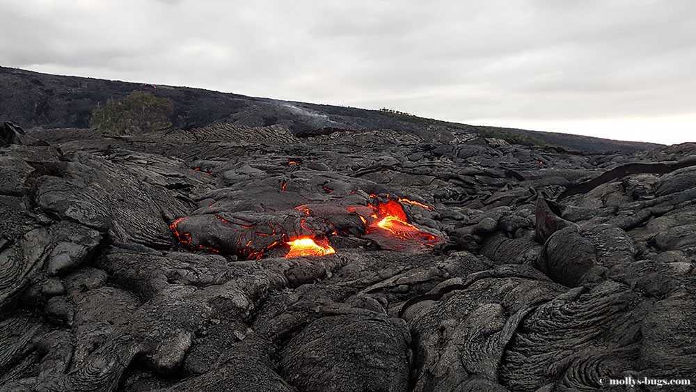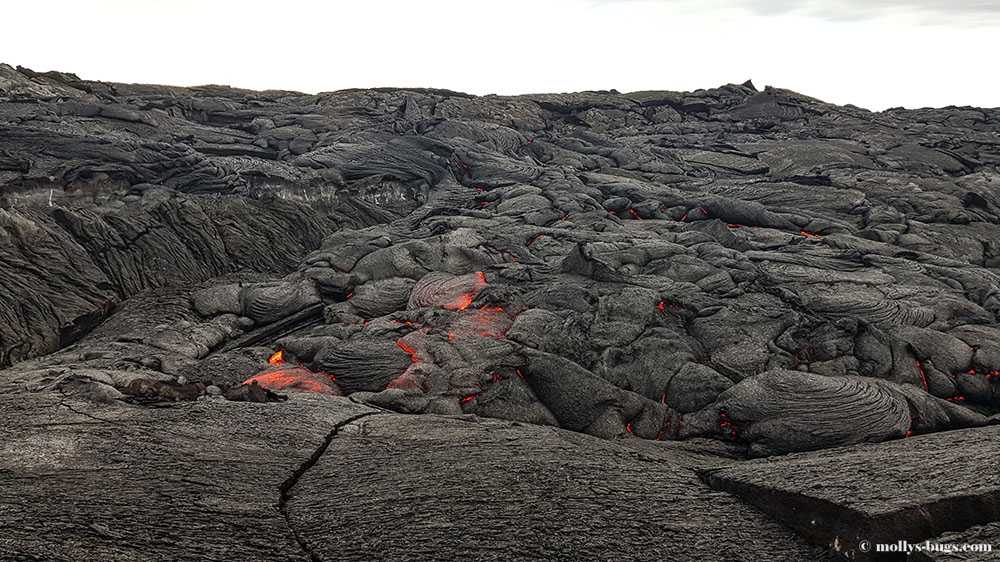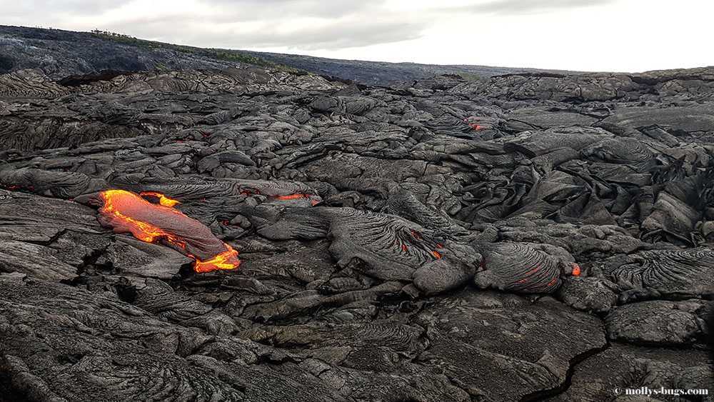 Первые несколько миль дорога идет по гравийке, которая то поднимается вверх, то опускается вниз, и в принципе, не сложно сохранять довольно быстрый темп ходьбы. Однако уже через 3 мили вы увидите, что дальше идти нельзя из-за того, на этой территории возможны обвалы. Лава, вытекая из вулкана, наслаивается друг на друге из-за чего под собственной тяжестью проседает и обваливается в океан. При чем обваливаются огромные площади этой лавы за один раз, поэтому заходить за ограждающие знаки очень опасно. Рядом находится табличка с приведенной статистикой, сколько человек уже погибло из-за того, что не придерживались правил безопасности на этом участке. Дальнейшее передвижение возможно только по застывшей лаве, что очень сильно замедляет скорость. Лава застывала очень неравномерно, иногда превращаясь в настоящие горы, а иногда проваливалась вниз, образовывая каньоны, поэтому нужно идти очень аккуратно. Этот материал очень хрупкий, поэтому здесь можно провалиться под землю. Саму лаву мы нашли не скоро – часа 2 пришлось пройти по лавовым полям, прежде чем ощутили невероятный жар, как будто перед нами открыли огромную духовку. И вот тут мы и заметили, что вокруг нас находится та самая раскаленная лава, которая уже 30 лет вытекает из этого вулкана. Находится вблизи нее очень сложно, ведь температура лавы во время выхода на поверхность составляет 1100 градусов, а это в 5 раз больше чем привычная нам духовка на кухне. Но зато здесь можно своими глазами увидеть то, что некоторые видят лишь по каналам National Geographic и Discovery.