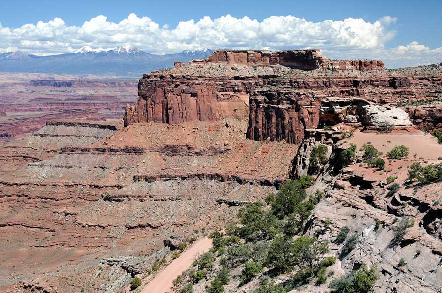 Каньонлэндс отличается от других подобных парков тем, что здесь нет никаких гостиниц, лоджей и супермаркетов. Это абсолютно дикое место, а цивилизация сводится к месту для кемпинга и дорогам. Часть из них грунтовые – «пузотерка» пройдет, но на некоторых участках нужен полный привод и клиренс побольше. Внизу на фото видно грунтовку. Олег, тут для масштаба