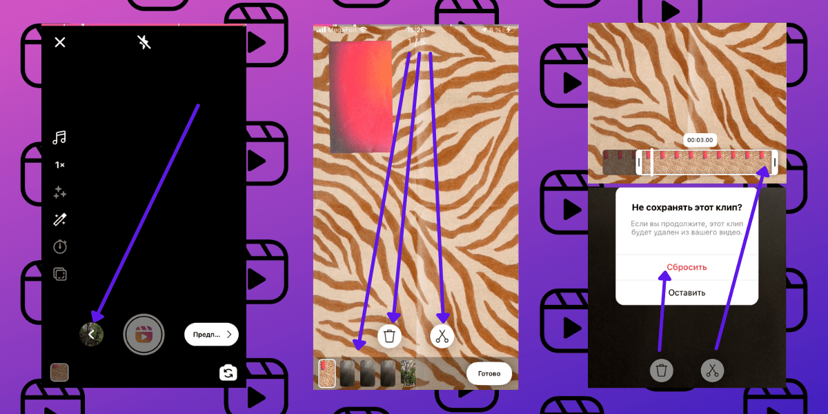 Вы можете сделать несколько клипов, как я уже писала выше, нажимая и отпуская кнопку с логотипом раздела для съемки. Чтобы отредактировать, просмотреть или удалить снятые клипы, нужно нажать на значок «Назад».