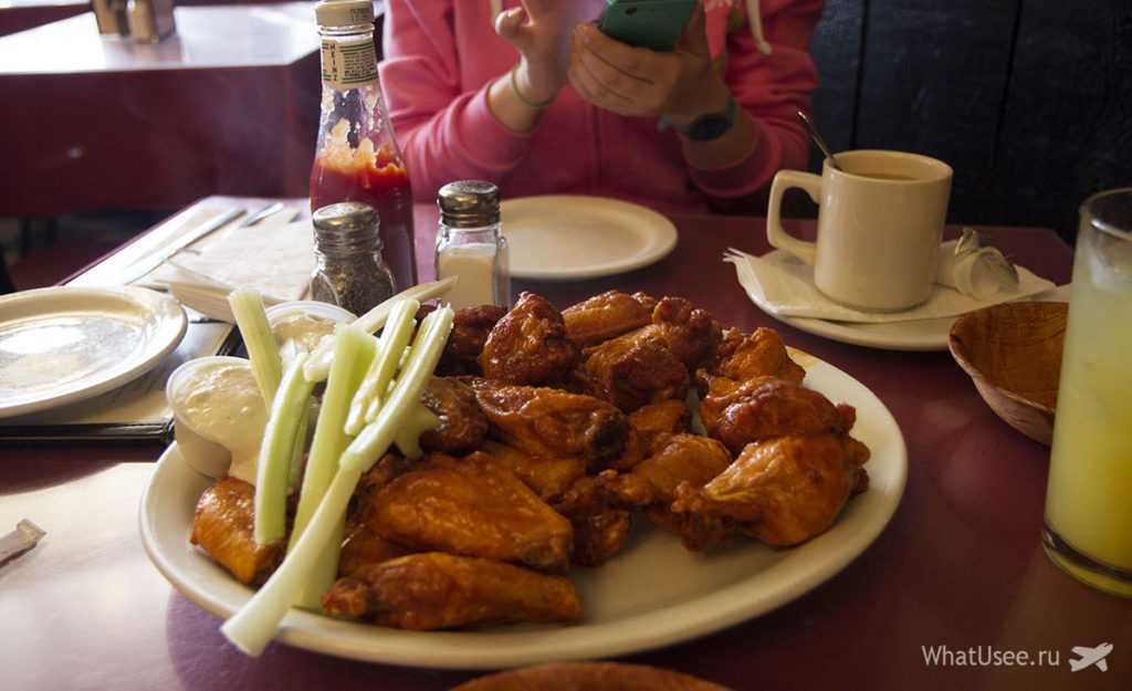 Идём к знаменитым крылышкам buffalo wings. Ресторан оказался полным народу, в основном, местных, но были и туристы. Заказали себе крылышки средней остроты: