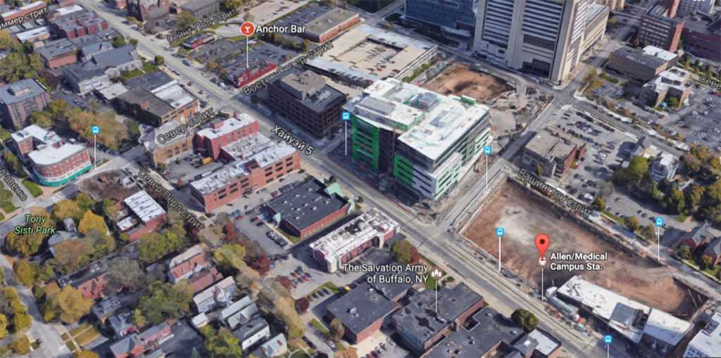 Изучив расписание автобусов Буффало — Ниагара-Фоллс и поняв, что у нас в запасе есть пара лишних часов в городе, мы сели в метро и направились к этому знаменитому заведению. Если завернуть за автовокзал Буффало, то вы увидите станцию Church Street Station. Это что-то вроде метрополитена. Можно сесть в поезд и доехали до станции Allen/Medical Campus Sta: