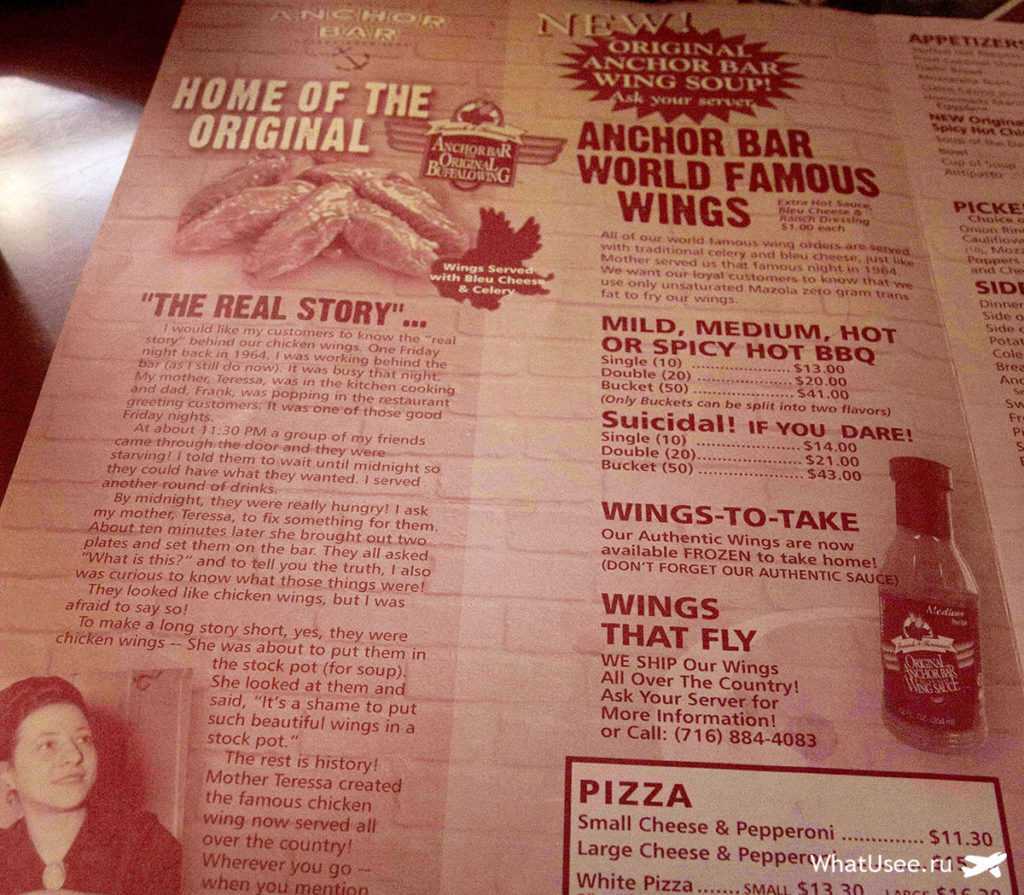 На автовокзале мы разговорились с местными ребятами о том, что можно быстро посмотреть в городе. Они посоветовали убить двух зайцев одновременно: увидеть одну из главных достопримечательностей Буффало, и перекусить. Иными словами, посетить Anchor Bar в Буффало, знаменитый своими крылышками buffalo wings — по легенде, здесь они и появились.